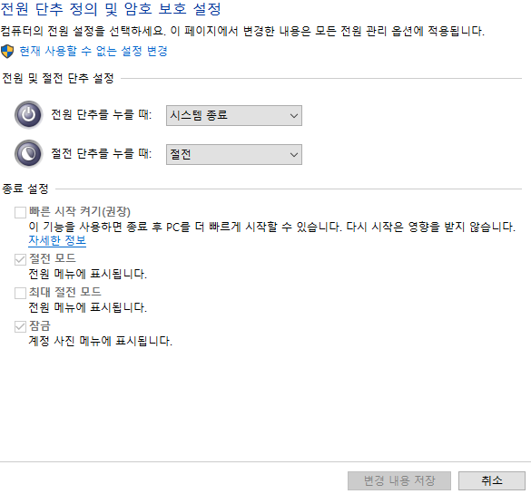 전원 단추 작동 설정 - 현재 사용할 수 없는 설정 변경 - 빠른 시작 켜기(권장) 체크해제 - 변경 내용 저장