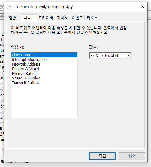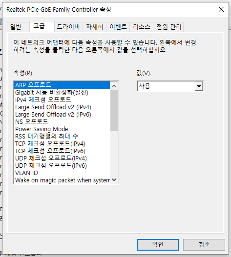 시작 - 장치 관리자 검색 - 네트워크 어댑터 - Realtek PCle GbE Family Controller - 속성 - 고급 탭