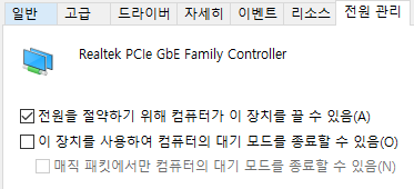 전원관리 탭 - 전원을 절약하기 위해 컴퓨터가 이 장치를 끌 수 있음(A) 만 체크